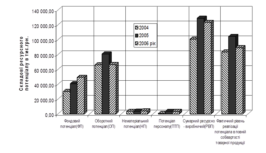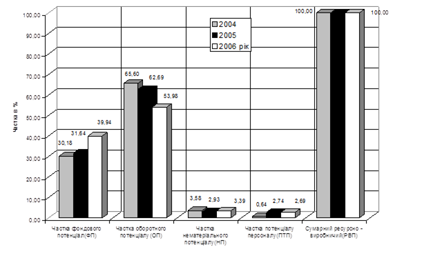 Рис.2.6. Динаміка структурних часток ресурсного потенціалу ВАТ «Київмедпрепарат" у 2004 -2006 роках