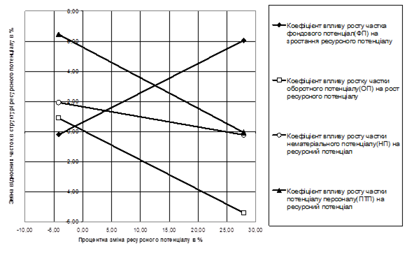 Рис.2.5. Структура та динаміка абсолютних величин складових ресурсного потенціалу ВАТ «Київмедпрепарат» 2.3 Аналіз основних чинників впливу на ресурсний потенціал підприємства ВАТ «Київмедпрепарат» У залежності від ступеня залучення у виробничо-господарську діяльність різні елементи ресурсного потенціалу відіграють неоднакову роль, тому при дослідженні структури ресурсного потенціалу варто виділяти в його складі активну і пасивну частини. До активної частини відносяться ресурси, що залучені в економічну діяльність і прямо впливають на її результативність: діючі основні виробничі і невиробничі фонди; нормативні запаси матеріальних цінностей у сфері виробництва і обертання; зайнята частина економічно активного населення; реалізована в технологіях, засобах, предметах і продуктах праці науково-технічна інформація. Ресурси, що маються в наявності, але не залучені в господарський оборот, відносяться до пасивної частини ресурсного потенціалу: наднормативні запаси і резерви матеріальних цінностей у сфері виробництва і обертання; незайнята частина трудових ресурсів; реалізована в проектах науково-технічна інформація; результати наукових і дослідно-конструкторських розробок. Виділення в складі ресурсного потенціалу активної і пасивної частин дуже важливо як з теоретичної, так і з практичних точок зору, оскільки воно дозволяє, по-перше, об'єктивно оцінювати ступінь використання ресурсного потенціалу, а, по-друге, виявляти інтенсивні й екстенсивні резерви підвищення ефективності виробництва. По ступені використання можливостей ланки, що хазяює, ресурсний потенціал підрозділяється на фактичний (досягнутий у даний момент) і перспективний. Така диференціація дозволяє оцінювати ступінь використання ресурсного потенціалу через порівняння перспективного рівня ресурсного потенціалу з його фактичним значенням. Основним етапом є визначення потенційних можливостей господарюючої системи.
