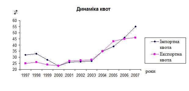 Рис. 1.1 Динаміка квот у зовнішній торгівлі України Розглянемо інші, ніж мита та імпортні квоти, види торговельних обмежень. До таких ми будемо відносити добровільні обмеження експорту, технічні, адміністративні та інші види регулювання. Такі торговельні обмеження виникли в результаті поширення діяльності торговельних картелів, розширення демпінгу та субсидіювання експорту. Останнім часом такі нетарифні обмеження стають дедалі все впливовішими в обмеженні торговельних потоків. Одним із важливих методів нетарифних обмежень є добровільне обмеження експорту. Під такими заходами ми будемо розуміти ситуацію, коли країна-імпортер змушує іншу країну, свого торговельного партнера, "добровільно" обмежити обсяг експорту під тиском застосування більш жорстких торговельних обмежень, якщо він загрожує діяльності промисловості країни-імпортера. Добровільні обмеження експорту є предметом переговорів між США, Європою та іншими країнами, як розвиненими, так і тими, що розвиваються, ще з середини 50-х років XX ст. в таких галузях, як сталеплавильна, текстильна, виробництво електроніки, автомобілів. Потоки міжнародної торгівлі також обмежуються численними технічними, санітарними, адміністративними та іншими правилами і нормами. Незважаючи на те, що більша частина таких вимог є розумною, існують і курйозні випадки, зокрема заборона на показ іноземних фільмів на британському телебаченні, заборона на рекламу віскі у Франції. Іншим торговельним обмеженням є законодавча вимога в багатьох країнах до власних урядів купувати лише товари вітчизняного виробництва. Міжнародні картелі є організацією виробників, які знаходяться в різних країнах (або групи урядів), і які погоджуються обмежити виробництво та експорт товарів з метою максимізації або збільшення валового прибутку членів організації. Хоча діяльність національних картелів заборонена в більшості країн, оцінити владу міжнародних картелів не так просто, оскільки їх діяльність не підпадає під юрисдикцію жодної з країн. Найбільш відомим у наш час міжнародним картелем є ОРЕС (Організація країн — експортерів нафти), який, обмеживши видобуток сирої нафти у 1973 та 1974 pp., змусив ціни на цей товар збільшитися в чотири рази. Торговельні перешкоди можуть виникати і внаслідок демпінгу. Демпінг — це експорт товару за ціною, нижчою від витрат на його виробництво, або у випадку, коли його ціна всередині країни є вищою за ціну, за якою продається даний товар за кордоном. Експортні субсидії — це прямі виплати або надання податкових пільг чи пільгових кредитів національним експортерам або потенційним експортерам, а також пільгових кредитів іноземним споживачам з метою стимулювання національного виробництва. В такому випадку експортні субсидії можуть розглядатися як форми демпінгу. Незважаючи на те, що експортні субсидії є незаконними згідно з багатосторонніми міжнародними угодами, велика кількість країн надає їх у прихованій формі. Заходи протекціонізму можуть стосуватися тих галузей, які повинні конкурувати з продукцією, що виробляється в країнах, які розвиваються і які мають менше економічної та політичної влади порівняно з розвиненими, щоб ефективно протистояти перешкодам на шляху їхнього експорту.[16, c. 184-185] Вищезазначені заходи державного та міжнародного регулювання процесів у зовніш