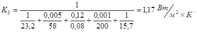 где α1 – коэффициент теплоотдачи от внутренней среды к внутренней поверхности потолка, α1 =23,2 Вт/(м2 *К); α2 – коэффициент теплоотдачи от наружной поверхности потолка в окружающую среду, α2 =17,4 Вт/(м2 *К); λ1 , λ2 , λ3 – коэффициенты теплопроводности стали, минеральной ваты и дюралюминия соответственно, λ1 =58 Вт/(м*К), λ2 =0,08 Вт/(м*К), λ3 =200 Вт/(м*К). Получаем