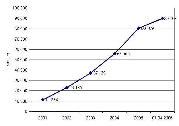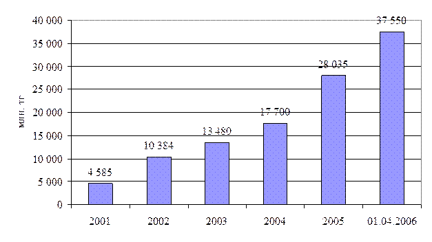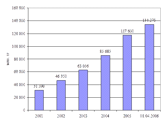 Источник: Годовой отчет НПФ АО «УларУмит за 2003-2005 гг. Анализируя таблицу 4 можно выделить, что пенсионные активы фонда НПФ АО «УларУмит» в 2004 году составили 85 685 млн. тенге, в 2005 году – 117 600 млн. тенге, на конец первого квартала 2006 года – 134 270 млн. тенге. За 2005 год пенсионные активы исследуемого фонда возросли на 31 915 млн. тенге, а за 1 квартал 2006 года на 16 670 млн. тенге. Виден значительный рост пенсионных активов, то есть только за первый квартал 2006 года прирост составил 50% от прироста за весь 2005 год. В связи с ростом пенсионных активов и с эффективной инвестиционной политикой начисленный инвестиционный доход фонда в 2005 году увеличился на 10 335 млн. тенге с 17 700 млн. тенге в 2004 году до 28 035 млн. тенге в 2005 году, за первый квартал 2006 года на 9 515 млн. тенге и составил 37 550 млн. тенге. По числу вкладчиков также наблюдается рост в 2005 году на 101 085 человека, в 2006 году на 87 990 человека. В 2004 году число вкладчиков составляло 1 028 899 человек, в 2005 году – 1 129 984 человека, 1 апреля 2006 года – 1 217 974 человека. То есть можно сделать вывод, что оттока вкладчиков не наблюдается. Это результат работы с вкладчиками, их информирование и пр.. На рис. 3 показан рост пенсионных активов с 2001 года. Рисунок 3. Динамика роста пенсионных активов АО «УларУмит» С 2001 года пенсионные активы возросли в 4 раза. Наблюдается ежегодный прирост пенсионных активов с ускорением темпов в 2006 году. Рост пенсионных активов – это один из важнейших показателей развития пенсионного фонда. Важным моментом в деятельности фонда, также является инвестиционный доход. Вкладчиками отдается предпочтение фондам эффективно работающими с их средствами. Утечка вкладчиков происходит в тех фондах, где нет инвестиционного дохода или он низок. По рис. 4 можно проследить темпы роста инвестиционного дохода исследуемого фонда. Рисунок 4. Динамика роста начисленного инвестиционного дохода АО «УларУмит» Наибольшие темпы роста доходов приходятся на 2005-2006 годы. Если в 2001 году был получен доход 4 585 млн. тенге, то на 1 апреля 2006 года он составил 37 550 млн. тенге, то есть в 8 раз больше. При меньших темпах роста пенсионных активов (в 4 раза) можно говорить о высокой эффективности инвестиций средств АО «УларУмит». При надлежащем уровне контроля за тем, куда вкладываются пенсионные сбережения, на стороне АО «УларУмит» будет постепенно аккумулироваться информация об инвестициях в объединенный инвестиционный портфель АО «УларУмит». Требуется выбрать инструмент для анализа эффективности вложений в этот портфель и предложить пакет рекомендаций по повышению качества портфельных инвестиций. На сегодняшний день не существует общей теории оптимизации портфеля, состоящего из различных видов ценных бумаг. Применительно к портфелям из бумаг группы В такая теория существует давно, однако она опирается на ряд предпосылок, которые в казахстанских реалиях не работают. По таблице 5 можно рассмотреть структуру инвестиционного портфеля. Таблица 5 Структура инвестиционного портфеля