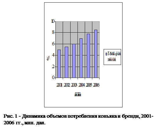 Коньяк относится к крепким алкогольным напиткам, традиционно пользующимся спросом у российских потребителей. По сравнению с традиционной для России водкой коньяк считается напитком более высокого класса. В условиях роста доходов населения, возможности широкого выбора различных алкогольных напитков, изменения потребительских предпочтений в сторону более качественной продукции темпы роста потребления коньяка в ближайшее время, по мнению большинства аналитиков, останутся довольно высокими (рис. 1). Вместе с тем, укладываясь в рамки общих тенденций, сформулированных в начале статьи для рынка алкогольной продукции в целом, процессы на рынке коньяков отличаются определенным своеобразием, а в ряде случаев и противоречивостью. Это своеобразие, по нашему мнению, обусловлено двумя особенностями коньяков как товарной группы. [17] Во-первых, по содержанию алкоголя коньяк имеет близкие аналоги – водку, виски и т.д., со стороны которых испытывает постоянное конкурентное давление, в то время как, например, вино полноценного аналога по этому признаку не имеет. Во-вторых, по сравнению с аналогами и заменителями, коньяки отличаются чрезвычайно большим ассортиментом и набором потребительских свойств, в силу чего представлены в гораздо более широком ценовом диапазоне. Это обстоятельство уже само по себе предопределяет неоднородность рынка коньяков и наличие на нем многочисленных сегментов, развитие которых порой подчиняется существенно различающимся закономерностям. Рынок коньячной продукции условно можно разделить на несколько ценовых сегментов. Нижний ценовой сегмент – это коньячная продукция, продающаяся в рознице по цене менее 180 рублей за бутылку 0,5 литра. В основном это коньяки трехлетней выдержки российского или молдавского производства.Средний сегмент представлен коньяками от 180 до 270 рублей за бутылку 0,5 литра. Сюда уже входит продукция повышенного качества – коньяки четырех- и пятилетней выдержки. Верхний ценовой сегмент составляет продукция стоимостью от 270 рублей за бутылку 0,5 литра. Это в основном армянские и грузинские коньяки пяти- и семилетней выдержки. На верхнем ценовом уровне этого сегмента находятся французские коньяки высшей категории качества, процент потребления которых на порядок меньше, чем у армянских и грузинских коньяков. [2] Анализ данных за последние несколько лет показывает, что рыночные доли различных ценовых сегментов относительно стабильны. При этом нижний сегмент «подпитывается» преимущественно за счет притока части потребителей водки, средний – за счет потребления любителей коньяка из нижнего сегмента. Для верхнего ценового сегмента очевидные источники «подпитки» не просматриваются. Видимо, поэтому при общем росте потребления коньяков абсолютный прирост объемов продаж в верхнем ценовом сегменте все же уступает приросту в нижнем и среднем сегментах. Косвенным подтверждением этому являются данные о ценовых предпочтениях потребителей, полученные компанией «Бизнес Аналитика»: даже в крупнейших российских городах 3/4 опрошенных предпочитают коньячную продукцию стоимостью до 300 рублей, т.е. попадающую в низкий и средний ценовые сегменты, выделенные «Бизнес Аналитикой». Более дорогостоящая коньячная продукция для большинства населения является пока недоступной в условиях существую