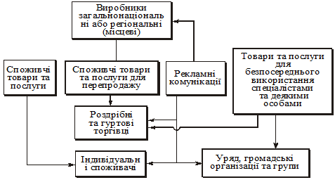 Рис. 2.1. Структура та зв’язки корпоративної реклами Корпоративна реклама має сприяти тому, щоб у думках споживачів склалося враження, що товар підприємства, що виходить на ринок або на ньому вже знаходиться, має певні конкурентні переваги щодо товарів інших виробників. Тому значення корпоративної реклами найкраще розкривається, якщо на сутність корпоративної реклами дивитись з точки зору закону перевиробництва. Тобто в економіці, яка виробляє більше товарів та послуг, ніж їх можна спожити або купити, реклама виробників та їхніх торгових посередників забезпечує споживачів інформацією про альтернативи вибору, а для виробництва (чи промислового, чи сільськогосподарського) створює сприятливі умови для ведення конкурентної боротьби, що сприяє зниженню цін на товари, що рекламуються, та просуває уперед науково-технічний прогрес у виробництві. Таким чином, корпоративна рекламна діяльність стала чинником конкурентної боротьби, не менш важливим, аніж досягнення переваг у технічних новаціях та зниження собівартості. Корпоративна реклама виявилася практично єдиним інструментом впливу на ринок. Це досягається впливом рекламної інформації на ринок, у процесі якого реклама, будучи єдино активною щодо ринку складовою маркетингу, здобуває унікальну можливість вийти за рамки корпоративної діяльності. Всі інші маркетингові заходи підприємства-виробника по суті не виходять за межі власних структур цього виробника. Крім того, виробники за допомогою корпоративної реклами мають змогу розробляти свої плани методом «снаружи внутрь». Такий ринковий підхід до пронесу планування та прогнозування обсягів продажу товарів базується на даних про покупців та споживачів [13]. Реклама взагалі може відбуватися від імені виробників, гуртових та роздрібних торговців, приватних осіб, а також від імені уряду, громадських організацій (інституцій) та груп. Але і корпоративна реклама може бути спрямована на ті ж групи. Це можна побачити на рисунку 2.2.