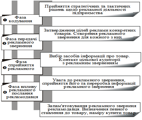 Рис. 3.1. Загальноприйнята схема класичної реклами товару Класична реклама товару використовує жорсткі та м’які підходи до потенційного споживача. Для кращого розуміння цілей та задач класичної реклами фахівці розкладають процес рекламної комунікації на окремі фази та визначаються щодо поведінки та впливу на споживача у кожній з цих фаз (рис. 3.2). На першій фазі перед поширенням рекламної інформації відбувається вироблення концепції реклами та кодування інформації, яку хоче надіслати виробник своєму потенційному споживачеві. У період другої фази процесу рекламної комунікації відбувається передача рекламного звернення носів реклами, який має поширення та відомість серед цільової аудиторії виробника та його товару [20]. У третій фазі відбувається контакт цільової аудиторії з рекламним зверненням виробника. Сприйняття та обробка інформації та її декодування залежать від зацікавленості у рекламі та самому товарі з боку потенційного споживача. На фазі воздействия відбувається запам’ятовування рекламного звернення та його тексту потенційним споживачем зі зміною або стабілізацією переваг у ставленні до товару виробника та зміною або стабілізацією поведінки споживача щодо цього товару.