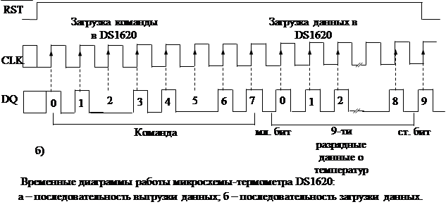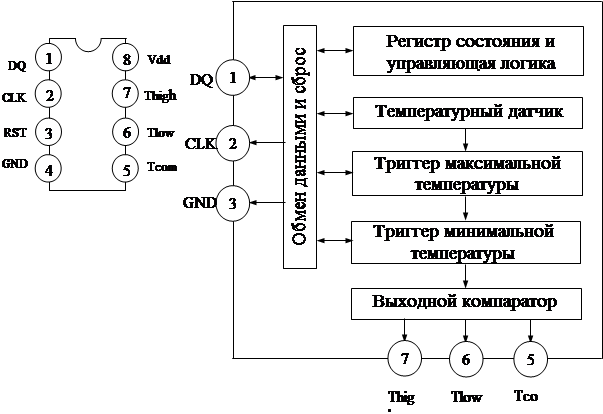 Передача данных от микросхемы к внешнему устройству осуществляется по трехпроводной последовательной шине: СLK/СОNV (контакт 2), DQ (контакт 1) и RЕSЕТ (контакт 3). Эти выходы совместимы с уровнями ТТЛ. Тhigt (контакт 7) – выход триггера высокой температуры. Если температура превышает установленный верхний порог, то выход Тhigt сигнализирует об этом высоким уровнем и остается в таком состоянии до тех пор, пока температура не упадет ниже заданного порога. Тlow (контакт 6) – выход триггера низкой температуры. Если температура опускается ниже определенного нижнего предела, то на нем появляется сигнал высокого уровня, сохраняющийся до тех пор, пока температура не поднимется выше указанного предела. Тсоm (контакт 5) – это выход комбинированного триггера высокой и низкой температуры. Тсоm=1, когда температура превышает верхний предел, Тсоm=0, когда она опускается ниже нижнего предела. Контакты 4 и 8 соединены с отрицательным и положительным проводами источника питания. Потребляемый ток в режиме ожидания равен 1 мкА, в рабочем режиме - 1 мА. Управление устройством осуществляется в два этапа: сначала команды управления последовательно загружаются в микросхему, а затем девятиразрядное число, соответствующее температуре, либо считывается, либо записывается. Микросхема имеет девять команд: 1. Read temp (AАh): чтение значения регистра, содержащего результат последнего измерения. 2. Start conversion T (EЕh): запуск процесса измерения температуры. Данные не передаются. 3. Stop convert T (22h): остановка измерения. Данные не передаются. 4. Write TH (01h): запись верхнего предела в триггер высокой температуры – 9 бит данных. 5. Write TL (01h): запись нижнего предела в триггер высокой температуры – 9 бит данных. 6. Read TH (A1h): чтение содержимого триггера высокой температуры – 9 бит данных. 7. Read TL (A2h): чтение содержимого триггера низкой температуры – 9 бит данных. 8. Write configuratioin (0Ch): запись настроечных данных в регистр настройки – 8 бит данных. 9. Read configuratioin (ACh): чтение настроечных данных из регистра настройки – 8 бит данных. Настроечное слово управляет режимами работы микросхемы DS1620. Оно сохраняется в регистре настройки. Функции битов регистра пиведены ниже: DONE THF TLF XXX CPU 1SHOT