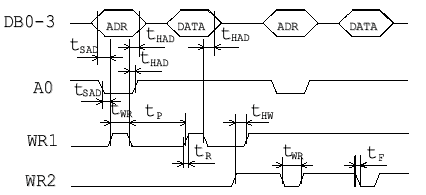Описание интерфейса ЖКИ модуля Сначала на шине выставляется адрес необходимого знакоместа, который фиксируется в регистре адреса при низком уровне на входе WRx (см.таблицу). Входы WR1 и ^WR2 защелкивают информацию, стоящую на шине, во внутренних регистрах статического типа. Внутри БИС эти входы объединены по схеме WR1 & ^WR2. Таким образом, информация запишется только при WR1 = “H” и ^WR2 = “L” одновременно. Такое решение осуществить функцию CS (выбор кристалла) при большом количестве модулей на шине, или если на шине имеются другие устройства. При записи адреса знакоместа указатель тетрады сбрасывается в положение SGx(L). Запись данных производится в младшую тетраду при высоком уровне сигнала на входе А0 сигналом WRx. По этому же сигналу указатель тетрады данных переключается в положение SGx(H), сохраняя при этом тот же адрес знакоместа. Данные в старшую тетраду SGx(H) записываются аналогично младшей тетраде SGx(L). После записи второй тетрады содержимое регистра адрема инкрементируется и можно записывать данные в следующее знакоместо без записи адреса. По адресу 0Fh расположен триггер блокировки шины. Запись в него DB0=”L” вызывает блокировку записи в БИС адресов и данных на 30 сигналов WRx. Разблокировка шины производится записью DB=”H” по адресу 0Fh. После подачи питания содержимое регистров SGx не определено, поэтому при включении питания необходимо делать программную очистку регистров. Состояние триггера блокировки тоже не определено, поэтому перед началом вывода информации на индикатор необходимо произвести разблокировку шины. Разблокировка шины производится записью DB0=”H” по адресу 0Fh.