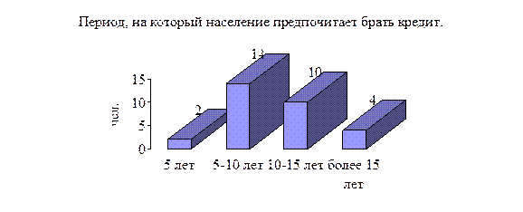 74% опрошенных людей считает, что самым распространенным способом приобретения жилья является получение кредита, 23% за счет собственных средств и 3% - это приобретение в рассрочку. Так как заработная плата у большинства населения не так уж велика гораздо легче, приобрести жилье в кредит, потому что не требуется вносить всю сумму сразу. Это позволяет приобрести жилье гражданам со средним достатком и молодым семьям, но для этого нужно иметь стабильный доход, что в наше время не так просто. Теперь установим сроки, на которые люди согласны взять кредит. Посмотрим на рисунок 8. Рис. 8