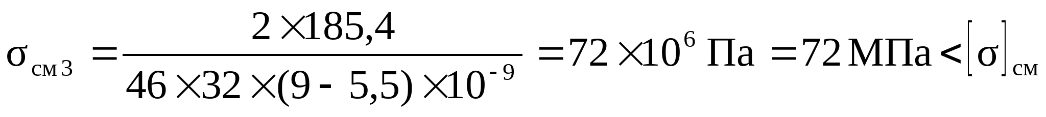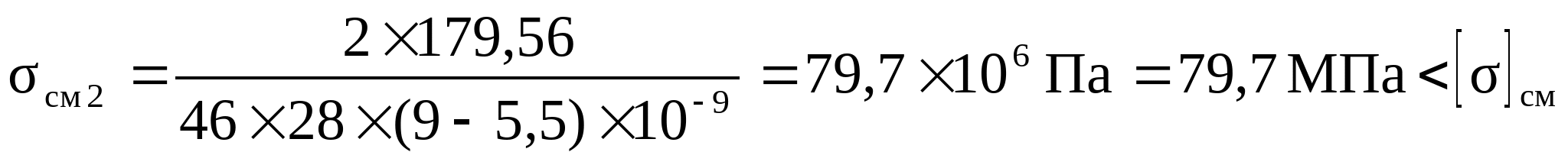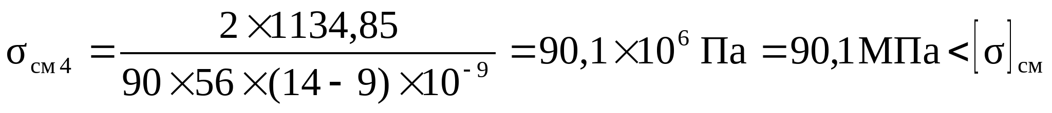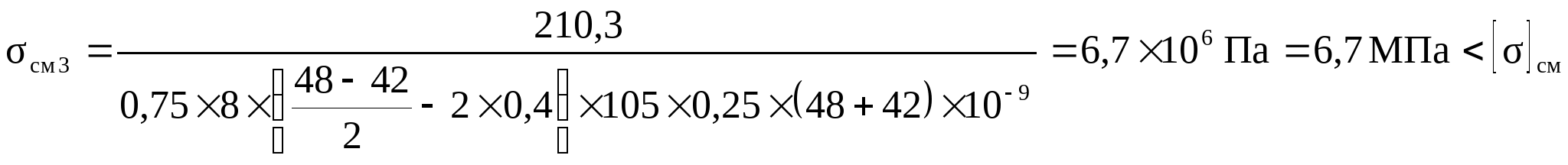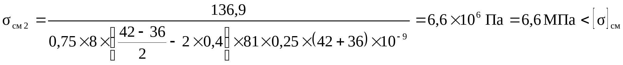 На третьем валу для зубчатых колес 8, 10 назначаем призматические шпонки 14Ч9Ч36 по ГОСТ 23360-78 . Проверку соединения на смятие производим по формуле (6.1):