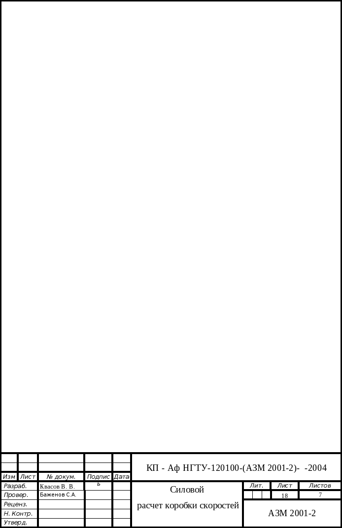 1 Расчет режимов резания и выбор электродвигателяСкорость резания при фрезеровании где где где Кг - коэффициент, характеризующий группу стали по обрабатываемости, Кг = 1; σВ -параметр, характеризующий обрабатываемый материал; σВ = 750 МПа; nV - показатель степени, nV = 0,9; По заданию Bmax = 300 мм. Bmin = (0,125ч0,25)Bmax = 37,5ч75 мм. Принимаем Bmin = 75 мм. При фрезеровании углеродистой инструментальной стали, марки У7А, принимаем глубину резания и подачу: при Bmax = 300 мм t = 4 мм, s = 0,25 мм/зуб; при Bmin = 75 мм t = 2 мм, s = 0,4 мм/зуб. Частота вращения фрезы: Сила резания при обработки заготовки определяется: где σВ -параметр, характеризующий обрабатываемый материал; σВ = 750 МПа; n - показатель степени, n = 0,3; Мощность при резании Для первого режима резания при ширине заготовки y = 0,28; u = 0,08; p = 0,1; q = 0,17: Частоту вращения фрезы вычисляем по формуле (1.4): Силу резания вычисляем по формуле (1.5) ,приняв по [1] x = 0,88; y = 0,75; u = 0,5; q = 0,87; w = 0: Мощность резания вычисляем по формуле (1.7): Для второго режима резания при ширине заготовки y = 0,28; u = 0,08; p = 0,1; q = 0,17: Силу резания вычисляем по формуле (1.5) ,приняв по [1] x = 0,88; y = 0,75; u = 0,5; q = 0,87; w = 0: Мощность резания вычисляем по формуле (1.7): При полученных расчетах получаем: Требуемая мощность двигателя: где Принимаем Выбираем электродвигатель асинхронный 4А 160М8 с мощностью Nдв = 11 кВт и синхронной частотой вращения nдв = 750 об/мин. МИНИСТЕРСТВО ОБРАЗОВАНИЯ РОССИЙСКОЙ ФЕДЕРАЦИИ НИЖЕГОРОДСКИЙ ГОСУДАРСТВЕННЫЙ ТЕХНИЧЕСКИЙ УНИВЕРСИТЕТ АРЗАМАССКИЙ ФИЛИАЛ Кафедра Технология машиностроения__________________________ Заведующий кафедрой ___________________________Пучков В. П.___ (подпись) (фамилия, и., о.) __________________________________________ (дата) __ Проектирование привода главного движения металлорежущего станка_________ _ фрезерной группы на основе модели 6Р13 _ _______________________________________________________________(наименование темы проекта или работы) ____________________________________________________________________________________________________ Пояснительная записка К_курсовому проекту по дисциплине <<Оборудование МП >>_________ (вид документа - проект дипломный, курсовой, исследовательская работа или часть и т. п.) КОНСУЛЬТАНТЫ РУКОВОДИТЕЛЬ По___________________________________ ________________Баженов С. А.___ (подпись) (фамилия, .и., о.) _______________________________________ (подпись) (фамилия,.и.,о.) __________________________________ (дата) _______________________________________ (дата) СТУДЕНТ 2. По___________________________________ Логунов А. В. (подпись) (фамилия,. и., о.) _______________________________________ (подпись) (фамилия, .и.о.) АЗМ 2001-2 (дата) (группа или шифр) _______________________________________ (дата) 3. По___________________________________ _______________________________________ (подпись) (фамилия,. и.о.) Проект защищен ________________(дата) _______________________________________ (дата) Протокол №_________________________ РЕЦЕНЗЕНТ С оценкой_____________________ _________________________________________ (подпись) (фамилия, .и.о.) ________________________________________ _______________________________________ (дата) 2004г. Содержание