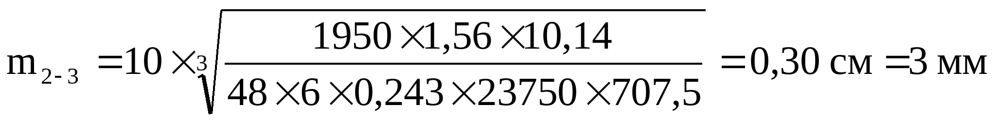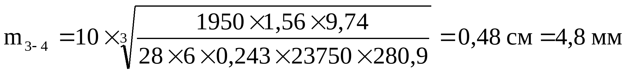 Определяем мощность, передаваемую каждым валом: где Выбираем материал для зубчатых колес сталь 40Х, термообработка улучшение 257НВ, предел выносливости где Для легированной стали: Принимаем Принимаем Допускаемое напряжение на изгиб по формуле (3.5): Для стальных зубчатых колес модуль определяется, исходя из условия прочности зуба на изгиб: где где где Принимаем Принимаем Мощность, передаваемая первым валом , по формуле (3.1): Частота вращения первого вала: Модуль для первого зацепления по формуле (3.7): Мощность, передаваемая вторым валом, по формуле (3.2): Частота вращения второго вала: Модуль для второго зацепления по формуле (3.7): Частота вращения третьего вала: Модуль для третьего зацепления по формуле (3.7): Принимаем m1-2 = 3 мм; m2-3 = 4; m3-4 = 5 мм. Межосевое расстояние: где Основные размеры зубчатых колес: диаметр делительной окружности: диаметр окружности впадин зубьев: диаметр окружности вершин зубьев: ширина колеса: где ширина шестерни: Размеры зубчатых колес вычисляем по выше перечисленным формулам и сводим в таблицу 3. Таблица 3 – Основные размеры зубчатых колес