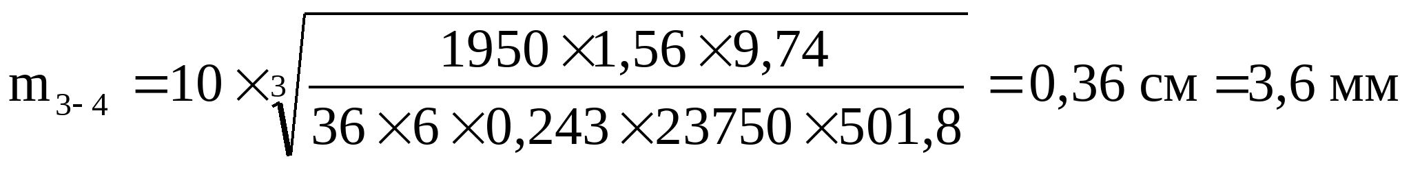 После уточнённого расчета диаметр четвертого вала увеличился на 11% по сравнению с предварительным расчетом, следовательно, диаметры остальных валов увеличиваем на 11%. Принимаем диаметры валов: dв1 = 34 мм, dв2 = 34 мм, dв3 = 40 мм, dв4 = 44 мм; диаметры валов под подшипниками: dп1 = 35 мм, dп2 = 35 мм, dп3 = 40 мм, dп4 = 45 мм; диаметры валов под колесами: dк1 = 36 мм, dк2 = 36 мм, dк3 = 42 мм, dк4 = 46 мм. Определяем мощность, передаваемую каждым валом: где Выбираем материал для зубчатых колес сталь 40Х, термообработка улучшение 257НВ, предел выносливости где Для легированной стали: Принимаем Принимаем Допускаемое напряжение на изгиб по формуле (3.5): Для стальных зубчатых колес модуль определяется, исходя из условия прочности зуба на изгиб: где где где Принимаем Принимаем Мощность, передаваемая первым валом , по формуле (3.1): Частота вращения первого вала: Модуль для первого зацепления по формуле (3.7): Мощность, передаваемая вторым валом, по формуле (3.2): Частота вращения второго вала: Модуль для второго зацепления по формуле (3.7): Частота вращения третьего вала: Модуль для третьего зацепления по формуле (3.7): Принимаем m1-2 = m2-3 = 3 мм; m3-4 = 4 мм. Межосевое расстояние: где Основные размеры зубчатых колес: диаметр делительной окружности: диаметр окружности впадин зубьев: диаметр окружности вершин зубьев: ширина колеса: где ширина шестерни: Размеры зубчатых колес вычисляем по выше перечисленным формулам и сводим в таблицу 3. Таблица 3 – Основные размеры зубчатых колес