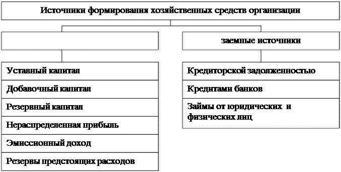Рисунок 2 - Объекты бухгалтерского учета Хозяйственные средства организации формируются за счет различных источников. Источники формирования хозяйственных средств по их принадлежности и целевому назначению подразделяются на собственные источники и заемные источники. Классификация источников формирования хозяйственных средств организации представлена на рисунке 3.