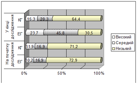 Рис. 2.19. Динаміка готовності майбутніх учителів початкових класів до формування естетичного досвіду молодших школярів. Отже, після формувального експерименту високий (креативний) рівень готовності до формування естетичного досвіду молодших школярів виявили 23,7% студентів експериментальної групи, порівняно з 10,2% на початку дослідно-експериментальної роботи, середній (частково-продуктивний) рівень – 45,8%, порівняно з 16,9%, низький рівень (індиферентний) – 30,5%, порівняно з 72,9% майбутніх учителів. Відповідно до здійсненої обробки даних у контрольній групі спостерігається несуттєва динаміка змін: високий рівень виявили 15,3%, порівняно з 11,9%, середній рівень – 20,3%, порівняно з 16,9%, низький рівень – 64,4% порівняно з 71,2% студентів. Оскільки припускаємо, що в результаті проведеного експерименту критерії готовності студентів до формування естетичного досвіду молодших школярів протягом формувального експерименту зросли статистично значущо, то з метою порівняння даних до- та післяекспериментальних виражених у відсотках, використано c2 -критерій, розрахований за формулою (1.1):