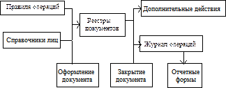 Схема 1. Порядок работы с документами Каждый документ оформляется на основании справочников (например, платежка на основании справочника организаций) и за каждым документом закрепляется определенное правило выполнения операции. При закрытии документа (закрытие - это своего рода аналог подписи на документе) автоматически выполняются проводки по документу, согласно закрепленному правилу. Эти проводки будут всегда тесно связаны с первичным документом. То есть если меняется документ - меняются и проводки, удаляется документ - удаляются проводки. Все проводки, выполненные в различных задачах комплекса, помещаются в единый журнал операций и служат в дальнейшем основанием для формирования всех основных отчетов (начиная от сальдо по счету и кончая балансом предприятия). Кроме формирования проводок, некоторые документы реализуют и другие хозяйственные операции (например, количественно-суммовое движение товаров).