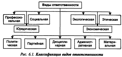 Ответственность и обязанность — неотъемлемый атрибут деятельности Полномочия и права, делегируемые руководителю, формируют круг проблем, которые он должен решать, разрабатывая и реализуя УР. За эту работу руководитель получает согласно договору материальное и моральное вознаграждение. Полномочия и права немыслимы без обязанностей и ответственности за выполненную работу. В словаре С.И. Ожегова имеются следующие толкования ключевых понятий данной темы. Обязанность — это круг действий, возложенных на кого-нибудь и обязательных для выполнения. Выделяют служебные, общественные и всеобщие воинские обязанности. Ответственность — это необходимость, обязанность отдавать кому-либо отчет в своих действиях, поступках. Ответственность может быть официальная и личная (чувство ответственности как черта характера). Виды ответственности Многообразие сфер деятельности компаний сформировало следующий типовой набор видов ответственности: профессиональная, юридическая (в том числе уголовная), социальная, экологическая, экономическая, этическая, политическая, партийная, дисциплинарная, административная, материальная (рис. 6.1). Профессиональная ответственность и обязанность руководителя отражаются в должностных инструкциях компании. Типовая должностная инструкция руководителя включает четыре раздела: общие положения, обязанности, права и ответственность.