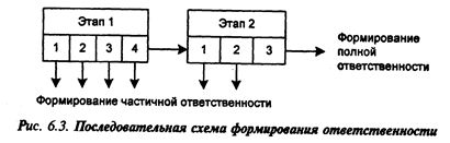 Социальная ответственность является свойством (чертой) характера личности наряду с чуткостью, скромностью, смелостью, щедростью, настойчивостью, гордостью и т.д. Ответственность личности — это черта характера, приобретаемая в результате воспитания и учета моральных норм общества. Развитие ответственности личности включает два этапа: овладение практическими правилами и осознание правил. Первый этап состоит из четырех последовательных стадий: • следование правилам своего «Я» (унаследованным или ранее приобретенным); • включение приемлемых правил, принятых в ближайшем окружении людей (производственном коллективе, неформальном объединении); • использование преимущественно корпоративных правил; • полное подчинение корпоративным правилам. J Второй этап включает три стадии: ] • механистическое восприятие правил (так всегда было и будет); • связывание правил с общественными, культурными, научными и другими авторитетами страны или мира; • связывание правил с конкретной общественно-политической и нравственной обстановкой, понимание возможности их изменения, ликвидации или возникновения новых. Этапы могут идти последовательно (рис. 6.3), параллельно и смешанно.