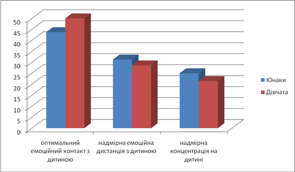 Отримані дані (табл.5) свідчать про високий рівень соціально-особистісної готовності. На другому етапі нами були проаналізовані результати методики «Батьківський твір», у якому брали участь 10 подружніх пар у віці від 18 до 26 років, що мають дітей. Методика проводилася з метою виявлення реального сприйняття батьками своїх дітей. Респондентам був запропонований написати твір на тему «Я и моя дитина». Пропонувалося написати все, що вони хочуть, вважають за потрібне і важливе. Середній обсяг творів 34 рядка. У ході аналізу робіт були отримані наступні результати. В 80% робіт простежується радо-щасливе відношення до ролі матері/батька і дитині зокрема. В інших творах любов до дитини є як би констатацією факту. Незважаючи на те, що у творах зазначено, що жінка/чоловік любить дитину, загальне враження, стиль викладу не дозволяють зробити висновок, що дитина є об'єктом любові й приносять жінці/чоловіку радість. Основна ідея цих робіт у тому, що «...бути матір'ю/батьком – це дуже відповідально...», «...я повинна/повинен багато чого зробити для своєї дитини...», «...я люблю Христину, адже вона моя дочка...». Виходить, що батьки змушені піклуватися про дитину, радості у цих турботах вони не бачать. Аналіз робіт дозволяє судити про те, що не менш 30% респондентів планували народження дитини («...вирішили, що дитину я буду народжувати тільки після того, як закінчу інститут...»). Щодо рівня знань жінок/чоловіків відзначимо наступне. 40% респондентів усвідомлюють недолік знань і досвіду, але при цьому вони також вказують, що намагаються читати відповідну літературу, дивитися телепередачі. Загалом, роботи дозволяють судити про середній рівень знань випробуваних, тому що є проблеми, пов'язані з вихованням дітей («...не можу вмовити поспати...», «...чоловік вважає, що починати виховувати треба вже зараз...», «...не можу відмовити моїй красуні...»). Слід зазначити, що для респондентів даної вибірки характерно те, що у вихованні дітей беруть участь і чоловікив («...з татовою допомогою розбираємося в машинах...», «...по вечорах чоловік любить повозитися з Данилкою...»). Це говорить про те, що батьки усвідомлено ставляться до народження дитини, хочуть бути поруч із нею. Отримані дані дозволяють зробити висновок, що жінки/чоловіки, які становлять вибірку даного дослідження усвідомлюють відповідальність за виховання й розвиток дітей, знають функції матері/батька. Таким чином, після двох етапів дослідження можна зробити наступні висновки: - Виявлено, що більша половина випробуваних позитивно ставиться до образу дитини та до батьківсьва в цілому; - 80% респондентів усвідомлюють ступінь відповідальності, яку беруть на себе батьки, що вирішили народити дитину; - Серед проблем, які виникають з народженням маляти, випробувані вказують в основному на фінансові труднощі й відсутність вільного часу, а також на недолік знань про процес виховання й розвиток дітей. На третьому етапі відбувалося дослідження психологічної готовності до батьківської ролі старшокласників. Аналіз відповідей старшокласників щодо оцінки функцій батьків та сім’ї показав, що половина юнаків (50 %) і більшість дівчат (60 %) здебільше згодні з тим, що сім’я дає можливість жити з коханою людиною, мати дітей (40 %/30 %), наповнює життя змістом (40 %/20 %) і упорядковує інтимні стосунки (30 %/ 20 %). Також юнаки менш впевнені в тому, що сім