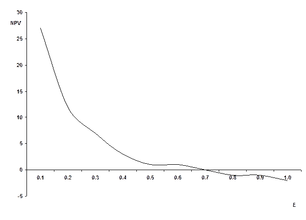 где I - единовременные капитальные вложения в момент времени 0; Пo = (CIFo - COFo) - ежегодные чистые поступления. Годовой экономический эффект в данном случае рассчитывается по формуле: Рассмотренные методы инвестиционных расчетов предусматривают предварительный выбор значения норматива дисконтирования Е, т.к. величина получаемого экономического эффекта во многом зависит от этого выбора. В связи с этим целесообразно применить метод рентабельности, при котором анализ инвестиционных проектов проводится по критерию внутреннего коэффициента эффективности Ер. В этом методе искомым оценочным показателем является такое значение норматива рентабельности капиталовложений, при котором обеспечивается равенство нулю интегрального экономического эффекта за весь инвестиционный период: где Ер - внутренний коэффициент эффективности инвестиционного проекта. Если внутренний коэффициент эффективности проекта превышает пороговое значение рентабельности капиталовложений, то проект считается экономически выгодным, в противном случае он отвергается. Определение этого коэффициента Ер проводится методом подбора, графическим способом или математическими методами. Для определения Ер графическим методом производится расчет показателя NPV для различных значений Е: На основе найденных значений строится график, находится точка его пересечения с осью абсцисс, что и соответствует искомому коэффициенту Ер = 0,7. Результаты инвестиционных расчетов позволяют инвестору оценить обоснованность планов развития предприятия, потенциального заемщика, ожидаемый уровень доходности и уровень его финансовой устойчивости. Анализ данных о финансовом состоянии объекта инвестирования и их динамики позволяют сделать вывод о достаточно высоком производственно-технологическом потенциале ЗАО «Дюртюлинский КМП». В свою очередь это является основанием считать, что исследуемое предприятие – привлекательный объект для инвестирования, который позволит получить доход, обеспечивая в то же время надежность вложения средств инвестора. Изучение теоретических основ инвестиционной деятельности предприятий и практики принятия инвестиционных решений дает основание предложить ряд мероприятий, призванных обеспечить эффективность капитальных вложений: 1. Обеспечение доступности и надежности информации об оценке текущего и перспективного положения потенциального объекта инвестирования; 2. Систематическое осуществление классификации активов, выделение сомнительные и безнадежные долги, создание резервов на покрытие возможных убытков; 3. Снижение стихийности в работе, организация систематического внутреннего контроля, обеспечивающего надежность выполняемых операций; 4. Использование системы раннего распознавания кризисной ситуации в кредитном учреждении на основе расчетов специальных индикаторов и отчетности; 5. Увеличение доли активов, приносящих доход, за счет увеличения объёма инвестирования надежных хозяйствующих субъектов; 6. Расширение клиентской базы, представляя тем самым больше возможностей по ведению активных операций путем повышения качества оказываемых и формирования новых услуг; 7. Усиление рыночных позиций инвестора за счет снижения рисков, повышения маневренности капитала для достижения определенного оптимума вложений. В совокуп
