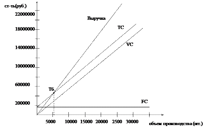 Вывод: так как все показатели рентабельности по планируемым 3 годам растут, можно сделать вывод, что предприятие работает достаточно эффективно. Точка безубыточности – это объем производства, при котором величина доходов равна величине расходов, т.е., это тот минимальный объем производства при котором предприятие покрывает все свои затраты без получения прибыли. Tб = FC : (P-VC) = 1 806 854 : (344,2 – 12 967 713 : 60 300 ) = 13 990