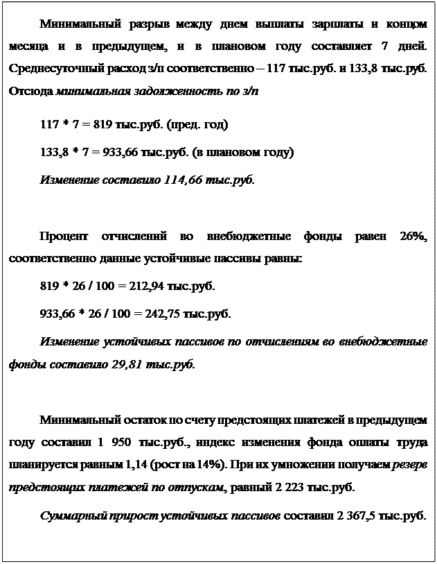 Прирост устойчивых пассивов. К устойчивым пассивам относятся не принадлежащие предприятию средства, но которые по условиям расчетов постоянно находятся в его обращении. Предприятие может до момента погашения задолженности распоряжаться ими по своему усмотрению. Поскольку такое положение может носить систематический характер, устойчивые пассивы являются объектом планирования. В качестве финансовых ресурсов планировать их целесообразно в минимальных размерах. К устойчивым пассивам относятся следующие средства: • задолженность по заработной плате рабочим и служащим предприятия; • отчисления во внебюджетные фонды, связанные с фондом оплаты труда, а также резерв предстоящих платежей по отпускам работающих; • задолженность поставщикам по неотфактурованным поставкам, авансовым платежам клиентов. При составлении финансового плана в качестве финансовых ресурсов планируется прирост устойчивых пассивов. Для расчета этой величины первоначально определяются устойчивые пассивы на конец планируемого года. 3атем методом сравнения устойчивых пассивов на конец планируемого года с устойчивыми пассивами, учтенными на начало планового периода, определяется величина изменения задолженности. Минимальная задолженность по заработной плате работникам предприятия (Зз ) рассчитывается как произведение среднесуточного расхода заработной платы (Рзс ), определенного делением фонда заработной платы четвертого квартала на 90 плановых дней или годового фонда на 360 дней, на число дней минимального разрыва (Др ) между днем выплаты заработной платы и последней датой месяца, за который она выплачивается: