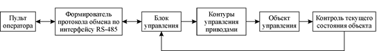 Рис.1. Структурная схема системы управления в общем виде Команды и данные, принятые от пульта оператора поступают на формирователь протокола обмена, где происходит проверка принятой информации на наличие ошибок, дешифрация команд и выделение из принятого пакета данных. Это же устройство должно формировать ответный пакет с данными, полученными от датчиков электромеханической системы. Наиболее рационально реализовать такое устройство программно. Далее блок управления принимает решение о возможности выполнения принятых команд на основе информации о текущем состоянии электромеханической системы. Также он предоставляет данные о текущем состоянии манипулятора для формирователя протокола обмена которыми он заполняет ответный пакет данных для пульта оператора. Контуры управления двигателями предназначены для создания заданного момента на двигателях при помощи усилителей, а управление усилителями происходит с помощью блока широтно-импульсной модуляции (ШИМ). Обратная связь реализована через систему очувствления, включающую в себя датчики и преобразователи сигнала. Основные контура управления замкнуты на пульт оператора через формирователь протокола обмена, а дополнительные контуры управления по скорости на основании, плече и локте замкнуты на блок управления, который и рассчитывает необходимые управляющие воздействия. Объектом управления является непосредственно манипулятор с шестью степенями свободы и схватом. Контроль текущего состояния объекта осуществляется при помощи системы датчиков. Т.к. манипулятор имеет шесть степеней свободы, то нам необходимо шесть датчиков углов, а для реализации дополнительной обратной связи по скорости в 3 степенях нам необходимо дополнительно установить датчики скорости. Таким образом, в системе управления будет 2 типа контуров управления приводами, один с обратной связью по скорости, второй без нее. Оба типа замкнуты через пульт оператора. Их структурные схемы приведены на Рис. 2 и Рис. 3.