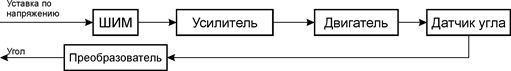 Рис. 3. Структурная схема контура без обратной связи по скорости Т.к. в контурах управления без обратной связи по скорости нет датчиков скорости, но имеется необходимость предотвращения перегрузок двигатели при, например, стопоре, то можно применить программное дифференцирование угла, для получения текущей скорости и сравнивать ее с заданным регулятором значением. Контур управления схватом обратной связи не имеет, поэтому на схват не требуется установка датчиков. Таким образом, структурная схема системы управления шестистепенным манипулятором примет вид, представленный на рисунке 4.