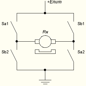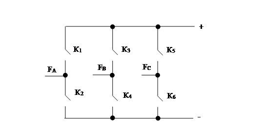 Рисунок 6. Н-мост Для того, чтобы двигатель вращался вперед ключи Sa 1 и Sa 2, обозначенные на рисунке, должны быть замкнуты. Если необходимо вращение в обратную сторону, что замыкаются ключи Sb 1 и Sb 2, а Sa 1 и Sa 2 при этом должны быть разомкнуты. Как видно, коллекторный двигатель постоянного тока прост в управлении. Но при этом обладает меньшим КПД, т.к. в единичный момент времени «полноценно работает» только 1 обмотка, а наличие щеточно-коллекторного узла приводит к искрению, стиранию контактов, что является причиной невысокой (по сравнению с другими двигателями) долговечностью. Существуют также бесконтактные двигатели постоянного тока, которые лишены недостатка коллекторных ДПТ, но имеют более сложную схему управления. Рассмотрим принцип действия такого двигателя: В первоначальный момент времени по обмоткам A, B, C протекают токи так, как указано на рисунке. Намагничивающая сила FR взаимодействует с потоком постоянного магнита ротора. Возникает вращающий момент, и двигатель приходит во вращение.