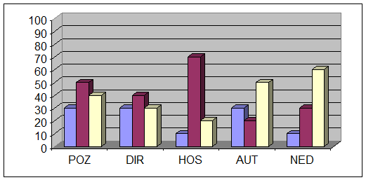 Гистограмму №1 «Степень выраженности параметров в отношении с матерьми». Из гистограммы №1 отчетливо видно, что: 1. По шкале позитивного интереса отношения с матерьми половина данной выборки входит в нормальное значение. Отчетливо выраженный позитивный интерес наблюдается у 40% родителей. Слабо выраженный показатель позитивного интереса наблюдается у 30% родителей в данной выборке. 2. По шкале директивности, также преобладает нормальное значение (40%). 3. По параметру враждебности в полной мере преобладает среднее значение (70%). В 20% случаев параметр враждебности отчетливо выражен. В 10% из общей выборки наблюдается слабо выраженный параметр враждебности. 4. По результатам данной выборки было выявлено, что наибольшее количество матерей дает большую степень автономности своим детям (50%). В 20% из 100% была получена норма по данному показателю. И у 30% матерей степень автономности по отношению к их детям слабо выражена. 5. По шкале непоследовательности данный параметр отчетливо выражен у 70% матерей. По результатам данной выборки в 30% данный параметр находится в норме, и лишь у 10% матерей этот показатель выражен слабо. Полученные результаты по отношению «отец-ребенок», были внесены в сводную таблицу №3, показывающую степень выраженности каждого признака во всей выборке, в процентном соотношении. Сводная таблица №2 «Степень выраженности параметров в отношении с отцами».