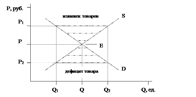 P1 P1 Q1 Q2 Q1 D2 Q2 граф.1 граф.2 Граф.1 - Изменение спроса (сдвиг кривой спроса D1 вправо в положение D2 ) показывает, что покупатели приобретают больше продукции при каждой цене. Так, при той же цене P1 покупатель будет приобретать уже количество товара, равное Q2 > Q1 Граф.2 - Так при изменении цены с P1 до P2 , когда все факторы, кроме цены, постоянны, движение осуществляется вниз по кривой спроса, увеличивая количество покупаемого товара от Q1 до Q2 . Тема 7. Взаимодействие спроса и предложения. 1. «Равновесие на рынке устанавливается, когда наибольший объем продукции находит сбыт». «Неудовлетворенный спрос, как и затоваривание, служит признаком нарушения равновесия». Прокомментируйте эти утверждения. Рыночная цена устанавливается под воздействием спроса и предложения. Рыночную цену называют еще ценой равновесия, поскольку она находится на том уровне, когда продавец еще согласен продавать (по более низкой цене продажа будет убыточна), а покупатель уже согласен купить (по более высокой цене покупка будет убыточна). Равновесная цена – это такая цена, при которой объем спроса равен объему предложения, и этот объем соответственно является равновесным объемом. Равновесие означает, что все покупатели, которые могут или хотят приобрести данный товар по цене Р, приобретут его, а все продавцы, которые желают и готовы продать по цене Р, продадут его. При этом на рынке не будет ни дефицита, ни излишков данного товара. Т.е равновесие наступит когда весь объем продукции найдет сбыт без дефицита и излишков этой продукции. 2. Можете ли Вы описать ситуацию, в которой повышение спроса и предложения приводит к увеличению равновесного объема, но не изменяет равновесной цены? Рыночный механизм действует таким образом, что любое нарушение равновесия влечет за собой его автоматическое восстановление.