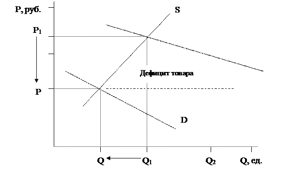 Время от времени, правительство вмешивается в работу конкурентного рыночного механизма, устанавливая максимальные или минимальные уровни цен. В таких случаях величина предложения становится не равной величине спроса, при введении потолка цен возникает избыточное предложение, в то время как при установлении минимальной цены появляется избыточный спрос. Конечным результатом являются диспропорции и неэффективность. В случае если несоответствие между спросом и предложением не будет устранено с помощью неценового распределения или купонного нормирования, то может возникнуть беспорядок и «черный рынок». На рис. Показана схема государственного контроля и вмешательства в ценовой рыночный механизм с его основными отрицательными последствиями. Цена «пола» - установленная минимальная цена, ограничивающая дальнейшее ее снижение. Цена «потолка», напротив, ограничивает повышение цены. Цены «пола» и «потолка» могут быть установлены государством, регулирующим ценообразование на рынке. Например, государство при осуществлении социальной политики может установить максимальные цены на отдельные виды продуктов питания (потолок цен), выше которых продавцы не вправе устанавливать свои цены. Примером цены «пола» может служить запрет на торговлю товарами по ценам ниже их себестоимости. Цены «потолка» занижены по сравнению с равновесной ценой и препятствуют повышению рыночной цены до уровня равновесия. Заниженные цены обычно устанавливаются в результате политики государства, направленной на «замораживание» цен, т.е. фиксирование их на определенном уровне с тем, чтобы приостановить инфляцию и воспрепятствовать снижению жизненного уровня. Нехватку товаров, которая возникает как результат занижения цен по сравнению с уровнем равновесия, обычно решают с помощью рационирования спроса путем введения карточной системы или других систем нормированного распределения. 4. Согласны ли Вы со следующим утверждением: «Прогресс технологии выгоден только производителям, но не потребителям»? Обоснуйте и проиллюстрируйте графически свой ответ. Нет не согласна, прогресс в технологии выгоден как для потребителей, так и для производителей. Применяя современные технологии, себестоимость товара снижается, отсюда снижение и его цены. Со сниженной ценой растут и объемы продаж == взаимовыгодное положение. В этом случае большее количество продукта становится доступным по более низким ценам и, следовательно, у людей повышается на него спрос.