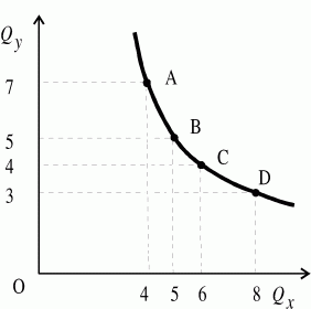 Hа представленной кривой безразличия мы выделили четыре равнополезные комбинации двух благ в точках A, B, C, D. Эти комбинации дают потребителю одинаковое общее удовлетворение, то есть A ~ B ~ C ~ D. Комбинации благ, представляющие для потребителя большую или меньшую полезность, будут находиться либо выше, либо ниже нашей кривой безразличия. Любая точка, взятая наобум, вместе с другими точками, дающими ту же величину удовлетворения, может образовать кривую безразличия. Кривые безразличия не пересекаются. Представим обратное. Предположим, что две кривые безразличия пересекаются в точке A. Hаборы A и B находятся на одной кривой i1
