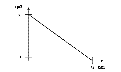 3. Функция полезности имеет вид: U(X1 , X2 )=X1 × X2 , где Х1 и Х2 – количества продовольственных и непродовольственных товаров. Их цены соответственно равны: Р1 = 10, Р2 =15. Доход потребителя равен 450 ед. Изобразите графически бюджетное ограничение и карту кривых безразличия. Какому потребительскому набору отдаст предпочтение потребитель? Линия бюджетного ограничения. Нач. ордината = I/P2=450/15=30, угловой коэффициент = Р1/Р2 = 10/15 = 0,67