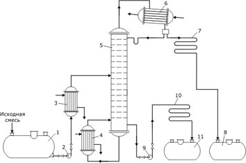 Рис. 1 Принципиальная схема ректификационной установки: 1 – емкость для исходной смеси; 2,9 – насосы; 3 – теплообменник-подогреватель; 4 – кипятильник; 5 – ректификационная колонна; 6 – дефлегматор; 7 – холодильник дистиллята; 8 – емкость для сбора дистиллята; 10 – холодильник кубовой жидкости; 11 – емкость для кубовой жидкости. Технологический расчет ректификационной колонны непрерывного действияЗадание Спроектировать ректификационную установку для разделения смеси. Смесь: ацетон – бензол . Количество исходной смеси: Состав исходной смеси: Состав кубового остатка: Состав дистиллята: Давление греющего пара: 5 ата Давление в колонне: 1 ата Вид контактных устройств: клапанные тарелки 1. Построение ступеней процесса ректификации1.1 Пересчет массовых долей в мольные