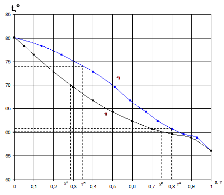 Рис. 3 Диаграмма t – x, y. 1 – линия жидкости; 2 – линия пара. 1.4 Минимальное флегмовое числоbmax = 0,35 (рис. 2)