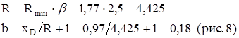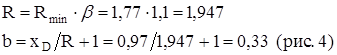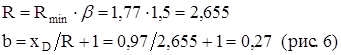 Рис. 10 Определение оптимального флегмового числа График (рис. 10), построенный на основе данных (табл. 2), показывает, что минимальный объем колонны будет иметь место при R=2,655. Примем это флегмовое число для дальнейших расчетов и соответствующее ему число теоретических ступеней nтс в = 19; nтс н = 5 1.7 Мольный расход жидкости в верхней и нижней части колонны