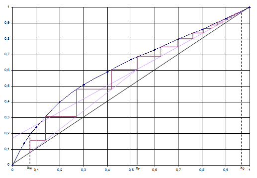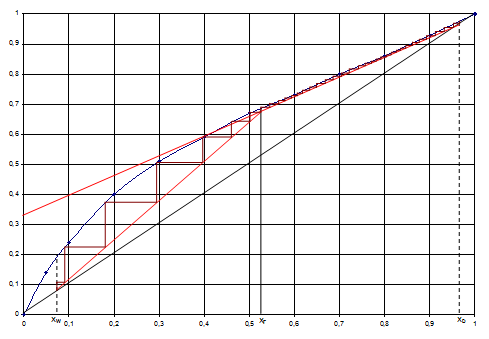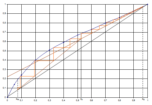Рис. 7 Графическое определение числа теоретических тарелок при