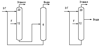 а б Рис. 1.6. Типичный процесс экстрактивной ректификации (а). Новый процесс экстрактивной ректификации (б). Предполагается, что этот способ может быть использован для разделения других систем. Методом вычислительного эксперимента авторы провели сопоставление традиционного и нового вариантов. Для расчета фазового равновесия они использовали уравнение NRTL. Число тарелок в новой экстрактивной колонне было равно числу тарелок в первой колонне традиционной схемы экстрактивной ректификации. Авторами получены профили концентраций компонентов по высоте колонны, которые существенно отличаются от профилей в традиционной схеме. Новый способ организации процесса позволяет несколько снизить энергетические затраты. Однако при этом снижается и качество продуктовых потоков, а при больших расходах ЭА содержание его в продукте, отбираемом в виде бокового потока, ещё увеличивается. Авторами [16] рассмотрены схемы с полностью связанными тепловыми и материальными потоками. Для осуществления тепловой связи между отдельными двухсекционными колоннами каждая из них в точке питания и в концевых точках соединяется со смежными колоннами противоположно направленными паровым и жидкостным потоками (см. рис. 1.7).