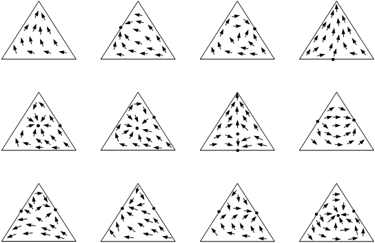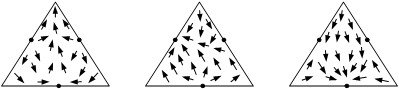 Совокупность нод образует в совмещенном концентрационном симплексе некоторое векторное поле, покрывающее весь симплекс или его часть. Данное векторное поле, которое является стационарным, то есть не зависит от времени, является геометрическим образом, отражающим физико-химическую природу рассматриваемой системы. На рис. 1.2 приведены векторные поля нод жидкость–пар для трехкомпонентных смесей. Точки, в которых длина вектора ноды равна нулю, а направление его неопределенно, называются неподвижными точками функции отображения или особыми точками диаграммы фазового равновесия. К таким точкам относятся, например, в случае фазового равновесия жидкость–пар точки, соответствующие чистым компонентам, и точки, соответствующие бинарным, тройным, четверным и другим азеотропам. В этих точках составы равновесных фаз равны друг другу, а для случая азеотропов в соответствии с законом Гиббса–Коновалова наблюдается экстремум температуры (при закрепленном давлении) или давления (при закрепленной температуре) [2].