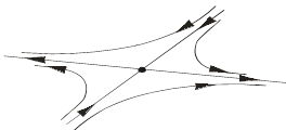 3.3.1-3б 3.3.1-4 Рис. 1.2. Векторные поля нод жидкость–пар для диаграмм различных классов и видов. Различают несколько типов особых точек, каждому из которых соответствует определенный ход дистилляционных линий. Например, для случая трехкомпонентных смесей в случае узловых точек все траектории сходятся в особой точке (устойчивый узел) или выходят из нее (неустойчивый узел). В случае седел – часть траекторий сходятся к особой точке, часть – выходят из нее и часть траекторий имеют в окрестности особой точки гиперболический ход, сначала приближаясь к ней, а потом удаляясь от нее. На рис. 1.3 показан ход дистилляционных линий в окрестностях особых точек различных типов.