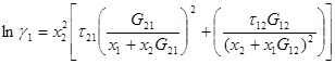 Было предпринято несколько попыток придать выводу уравнения Вильсона более строгое теоретическое обоснование и в некотором отношении улучшить его. Так, Моулрап вывел это и ряд других уравнений, используя одну из модификаций уравнения Ван-дер-Ваальса, в которой учитывается локальный состав, при этом он исходил в каждом случае из различных допущений. Нитта и Катаяма рассматривают уравнение Вильсона как вывод теории ассоциированных растворов. Цубока и Катаяма считают его частым случаем своих выкладок, предполагающим равенство молярных объемов компонентов. Уравнение Вильсона позволяет точно представить равновесие жидкость–пар в двух- и многокомпонентных системах с использованием только параметров бинарного взаимодействия. К тому же оно отличается простотой. Еще одна положительная особенность этого уравнения состоит в том, что в нем заранее учтен температурный эффект [42]. Для представления равновесия жидкость–жидкость нельзя непосредственно применить уравнение Вильсона [4]; использование в этих целях его модификации, уравнения Цубоки–Катаямы , дает удовлетворительные результаты, хотя последнее не было подвергнуто такой тщательной экспериментальной проверке, как другие уравнения. Уравнение Вильсона положено в основу метода групповых вкладов ASOG, используемого для получения коэффициентов активности. В [43] авторы определяли число корней уравнения Вильсона по данным о единственной бинарной точке. Термодинамический анализ этой модели с использованием парциальных избыточных функций был проведен в [44]. Уравнение NRTL (nonrandom two-liquid) для избыточной энергии Гиббса выводят, основываясь на теории, согласно которой жидкость в двухкомпонентной системы имеет ячеистую структуру, причем эти ячейки (кластеры) состоят из молекул типа 1 и 2, каждая из которых окружена такими же молекулами, которые в свою очередь имеют аналогичное окружение, и т.д. Итоговое уравнение для избыточной энергии Гиббса имеет вид: