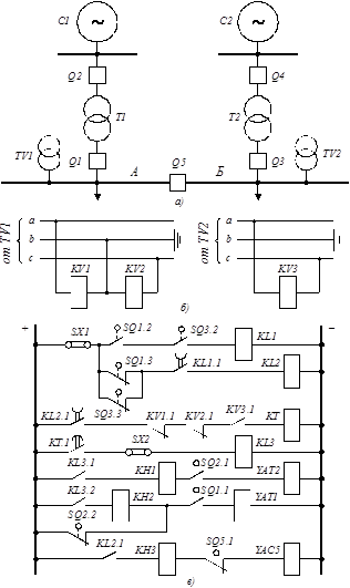 Рис.2.1–Схема АВР секционного выключателя: а) схема первичных соединений; б) цепи переменного напряжения; в) цепи оперативного тока Исходно оба трансформатора T1 и T2 включены и осуществляют питание потребителей секций шин низшего напряжения, а выключатель Q5 выключен. При отключении по любой причине выключателя Q1 трансформатора T1 его вспомогательный контакт SQ1.2 размыкает цепь обмотки промежуточного реле KL1. В результате контактная система реле KL1 при снятии напряжения возвращается в исходное положение с некоторой выдержкой времени и размыкает контакты. Второй вспомогательный контакт SQ1.3 выключателя Q1, замкнувшись, подает плюс через еще замкнутый контакт KL1.1 на обмотку промежуточного реле KL2, которое своими контактами производит включение секционного выключателя Q5, воздействуя на контактор включения YAC5. По истечении установленной выдержки времени реле KL1 размыкает контакт KL1.1 и разрывает цепь обмотки промежуточного реле KL2. Если секционный выключатель Q5 включится действием схемы АВР на неустранившееся КЗ и отключится релейной защитой, то его повторного включения не произойдет. Таким образом, реле KL1 обеспечивает однократность АВР и поэтому называется реле однократности включения. Реле KL1 вновь замкнет свои контакт KL1.1 и подготовит схему АВР к новому действию лишь после того, как будет восстановлена нормальная схема питания подстанции и включен выключатель Q1. Выдержка времени на размыкание контакта KL1 должна быть больше времени включения выключателя Q5, для того чтобы он успел надежно включиться. С целью обеспечения АВР при отключении выключателя Q2 от его вспомогательного контакта SQ2.2 подается команда на катушку отключения YAT1 выключателя Q1. После отключения Q1 схема АВР запускается и действует, как рассмотрено выше. Аналогично рассмотренному выше АВР секционного выключателя будет действовать и при отключении трансформатора Т2. Кроме рассмотренных случаев отключения одного из трансформаторов потребители также потеряют питание, если по какой-либо причине останутся без напряжения шины высшего напряжения. Схема АВР при этом не подействует, так как оба выключателя T1 (QI и Q2) или Т2 (Q3 и Q4) останутся включенными. Для того чтобы обеспечить действие схемы АВР и в этом случае, предусмотрен специальный пусковой орган минимального напряжения, в состав которого входят реле KV1, KV2 и KV3. При исчезновении напряжения на шинах высшего напряжения питающих T1, а следовательно, и на шинах А минимальные реле напряжения, подключенные к трансформатору напряжения TV1, замкнут свои контакты и подадут плюс оперативного тока на обмотку реле времени КТ через контакт реле KV3. Реле КТ при этом запустится и по истечении установленной выдержки времени подаст плюс на обмотку выходного промежуточного реле KL3, которое произведет отключение выключателей Q1 и Q2 трансформатора T1. После отключения выключателя Q1 схема АВР подействует, как рассмотрено выше. Реле напряжения KV3 предусмотрено для того, чтобы предотвратить отключение трансформатора T1 от пускового органа минимального напряжения в случае отсутствия напряжения на шинах низшего напряжения другой секции, когда действие схемы АВР будет заведомо бесполезным. Реле KV3, подключенное к трансформатору напряжения TV2 секции шин Б, при отсутствии напряжения на ней размыкает контакт KV3.1 и разрывает цепь от конт