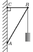 | 3. Вантаж масою 5,19 кг підвішено до невагомих стержнів (див. рисунок). З'єднання у точках А, В, С є шарнірними. Довжина стержня АВ становить 70 см, довжина стержня ВС -35 см. Визначте силу, що стискає стержень АВ. Уважайте, що g = 10 м/с2