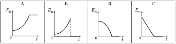 | 5. Пластилінова кулька вільно падає на підлогу без початкової швидкості. Укажіть графік, що відображає залежність потенціальної енергії цієї кульки від часу.