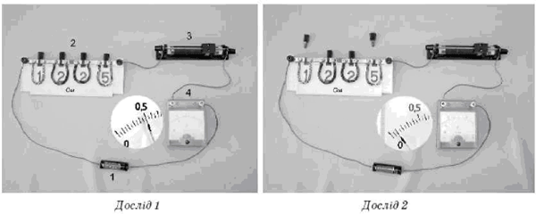 | 31. Електричне коло складається з гальванічного елемента (1) з внутрішнім опором 0,5 Ом, магазину резисторів (2), реостата (3) та амперметра (4). Проведено два досліди (див. фотографії). Визначте кількість теплоти, що виділялася за 1 хв у обмотці реостата під час досліду 1. Опір реостата в обох дослідах однаковий. Результат запишіть у джоулях. Довідка: магазин резисторів являє собою чотири послідовно з'єднані дротяні спіралі, опори яких дорівнюють 1 Ом, 2 Ом, 2 Ом, 5 Ом. Кожна спіраль може вмикатися в електричне коло чи вимикатися з нього шляхом видалення чи встановлення спеціальної металевої перемички. Коли всі перемички вставлені, загальний опір магазину можна вважати рівним нулю, коли всі видалені — рівним 10 Ом.