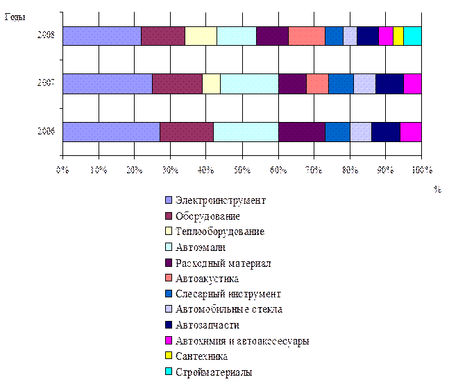 Как уже упоминалось выше, в конце 2007 года предприятием был получен инвестиционный кредит сроком на три года на строительство нового магазина. Также в июле 2009 года было оформлено соглашение о предоставлении краткосрочного кредита (овердрафта). 2.2 Анализ товарного ассортимента Магазин «Хамелеон» предлагает своим клиентам обширный перечень автозапчастей, аксессуаров, инструментов, акустики, автоэмалей, расходных материалов, слесарного инструмента. Для удобства анализа товарный перечень был разбит на товарные группы, сходные по назначению и характеристикам. Ассортимент товаров, реализуемых в магазине «Хамелеон» ИП Белоусов А.Л., а также структура товарооборота магазина «Хамелеон» в 2006-2008 годы представлен в таблице 6. Таблица 6 - Анализ структуры товарооборота магазина «Хамелеон» в 2006-2008 годы