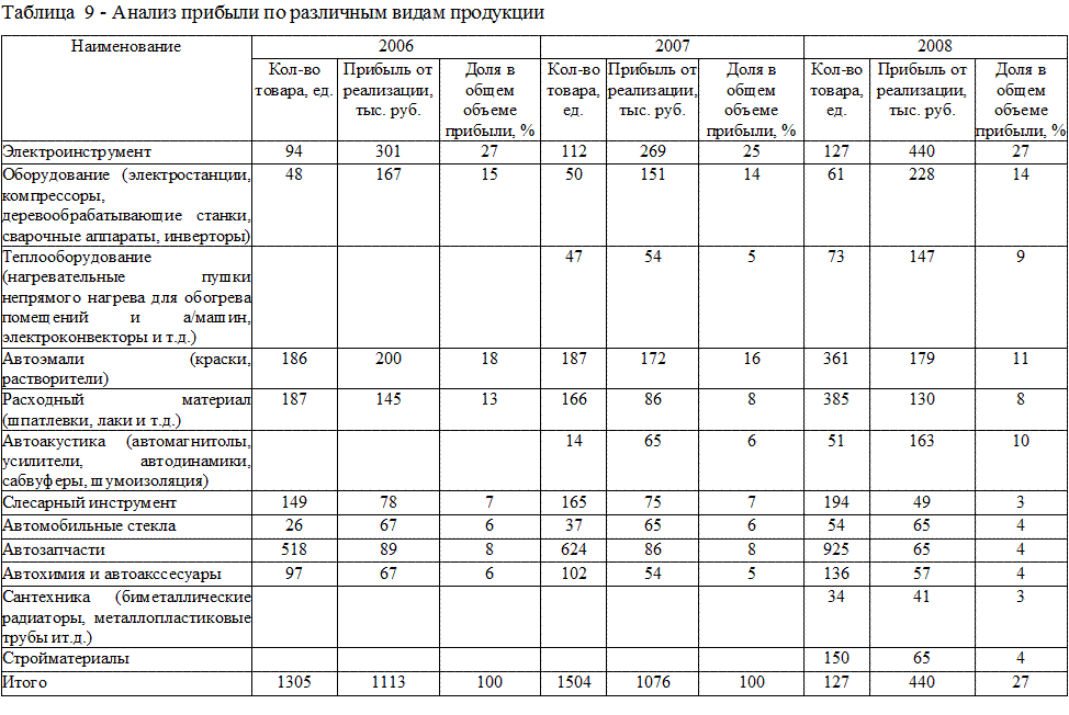 Рисунок 2 - Структура сбыта по различным видам продукции за 2006 - 2008 годы Таблица 8 - Анализ сбыта по различным видам продукции