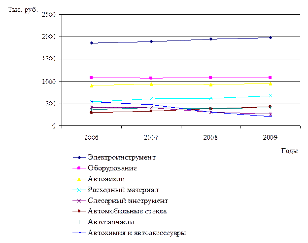 Рисунок 4 - Прогноз дохода магазина на 2009 В таблице 16, показан возможный объем реализации при сохранении имеющейся тенденции в разрезе товарных групп по магазину в 2009 году. При этом, прогноз реализации строился только по тем товарным позициям, которые присутствует в магазине в течение трех лет, так как по 1-2 годам прогноз будет не актуальным. Если сравнить прогнозные оценки с объемом продаж в прошлом, то предполагается, что в ближайшем будущем динамика продаж будет более сильной. При этом доход магазина увеличится на 30,96 тыс. руб. Кроме того, для увеличения доходов и для расширения ассортимента руководству можно рекомендовать проведение опросов и анкетирования клиентов магазина, с целью выявления предпочтений потребителей и максимального их удовлетворения. Также одним из способов оптимизации ассортимента товаром может быть учет пожеланий клиентов к качеству товара, а также к производителю. ЗАКЛЮЧЕНИЕ Ассортиментная политика - одно из самых главных направлений деятельности маркетинга каждого предприятия. Особенно это направление приобретает особую значимость в нынешних условиях перехода к рыночной экономике, когда к товару со стороны потребителя предъявляются повышенные требования по качеству и ассортименту, и от эффективности работы предприятия с товаром зависят все экономические показатели организации и рыночная доля. Как свидетельствует мировой опыт, лидерство в конкурентной борьбе получает тот, кто наиболее компетентен в ассортиментной политике, владеет методами ее реализации и может максимально эффективно ею управлять. Индивидуальный предприниматель Белоусов Анатолий Леонидович, осуществляет свою деятельность с 19.04.2001 года, свидетельство № 5055, выданное Муниципалитетом города Тынды. Магазин начал работу в небольшом арендуемом помещении «Автоцентра КАМАЗ». Основным видом деятельности являлась розничная торговля красками, лаками, автозапчастями, автомобильной аппаратурой. Валюта баланса увеличивалась на протяжении рассматриваемого периода, наиболее существенный прирост произошел в 2008 году по сравнению с 2007 г. Увеличение активов произошло за счет увеличения остатков товаров для перепродажи, увеличение пассивов - за счет роста собственного капитала. Выручка 2008 года по сравнению с 2007 выросла в 1,15 раза, это связано прежде всего с расширением ассортимента товаров. Расходы на закупку товаров в данном случае связаны со спецификой предприятия и включают в себя широкий перечень автоэмалей, аксессуаров, оборудования. Коэффициент обновляемости продукции колеблется приблизительно на одном уровне (Коб.ср. = 0,61), а значит, каждый год в ассортимент реализуемой продукции добавляется и извлекается примерно одинаковое количество товаров. Следует отметить, что интенсивное изменение ассортимента реализуемой магазином продукции достигается путем торговли запчастями, динамика изменения разновидностей которых велика. С каждым годом появляется все большее количество разновидностей последних. Магазин же в свою очередь стремиться сформировать наиболее эффективную структуру ассортимента как добавляя новые виды продукции, так и изымая старые. В абсолютном и в относительном значении наибольшую долю в объеме сбыта, занимает электроинструмент - 1942 тыс. руб., или 25 % в общем объеме реализации. Наименьшее место в структ