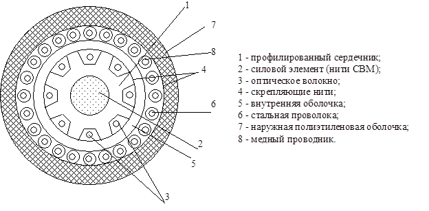 При выборе конструкции кабеля следует учитывать, что зоновые кабели имеют конструкцию с фигурным сердечником. Зоновые кабели предназначены для связи областного центра с районами и городами области. Дальность связи находится как правило в пределах сотни километров. Кабель зоновой связи (марка ОЗКГ) содержит 8 градиентных волокон, расположенных в пазах профилированного пластмассового сердечника. Так как кабель предназначен для непосредственной прокладки в грунт, он имеет защитный броневой покров из стальных проволок диаметром 1,2 мм. Дистанционное электропитание регенераторов осуществляется по четырем медным изолированным проводникам, расположенным в броневом покрове кабеля. Снаружи кабель имеет полиэтиленовую оболочку. Изготавливаются также оптические кабели зоновой связи, в которых цепи дистанционного питания отделены от броневых проволок алюминиевым экраном и расположены внутри кабеля. Кабель может содержать 4 или 8 волокон. Как наиболее подходящий выберем кабель марки ОЗКГ-01. Основные характеристики приведены в таблице 4, 5. Таблица 4