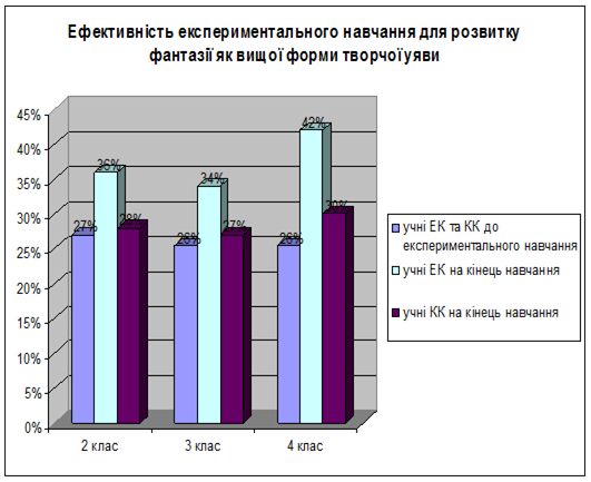 Вправа 3. Творчий диктант. Записати текст. Птахи — наші друзі. Вони знищують шкідників лісу. А ще вони радують нас своїм співом. Бережіть птахів! Перебудувати текст. Треба берегти птахів. Вони... Вправа 4. Дидактична гра “Кола на воді”. Діти вибирають довільне слово. Воно записується на дошці стовпчиком. На ці букви добираються нові слова, до слів – речення. На основі отриманих результатів складають оповідання, казку, веселу історію, вірш. Вправа 5. Доповнити розповідь: Тоді, в дитинстві, Івась мріяв про далекі мандрівки і незвичайні пригоди. Майбутнє уявлялося йому так… 3 клас Вправа 1. Записати текст. Подумайте, який це текст: розповідь чи міркування? ЧИМ ЖИВЛЯТЬСЯ ЛЕЛЕКИ? Лелеки живляться жабами, ящірками, гадюками, рибою. Охоче поїдають шкідливих комах Не минають нагоди, аби схопити мишу чи пацюка. Записати текст-міркування, використавши слова із тексту-розповіді. Лелеки — корисні птахи, бо вони… Вправа 2. Біном фантазії. Напиши розмову двох кактусів. Вправа 3. Пофантазуй. Що мені розповіла сніжинка? Прийшла зима – білосніжка. В своїм чарівнім кошику принесла сніжинки. Кружляли сніжинки в повітрі і тихо спускалися на землю. Спіймала сніжинку і я… Вправа 4. Прочитай вірш і придумай кінцівку. Навіщо плаче хлопчик? Як бурулька плаче - То весна надворі. Як роса заплаче То вже ранок скоро. Як заплаче дощик - Трави підростають. А навіщо хлопчик Плаче - Я не знаю. (А. Костецький) Вправа 5. Прочитай подані речення. Вибери ті, що тобі подобаються, і склади з ними текст на тему «Весна квітує». Запиши свій текст. Прийшла вже весняна радість. Надійшла квітуча весна. На вербі зацвіли котики. Берізка прокинулась від зимового сну. Берізка вдягла свої сережки і готує святкове зелене вбрання. Буйно цвітуть проліски. Наче блакитним килимом, вкрили землю проліски. Незабаром зацвітуть сади. Скоро білими квітами вкриються сади. 4 клас Вправа 1. Біном фантазії. Склади розповідь про те, що б трапилося, якби ожили речі в кімнаті? Вправа 2. Дидактична гра “Кола на воді”. Діти вибирають довільне слово. Воно записується на дошці стовпчиком. На ці букви добираються нові слова, до слів – речення. На основі отриманих результатів складають оповідання, казку, веселу історію, вірш. Вправа 3. Використай приклад та опиши тваринку по-своєму. Білочка Хвіст трубою, спритні ніжки - Плиг із гілки на сучок Носить білочка горішки В золотий свій сундучок. В неї очі мов горішки, кожушина хутряна, Гострі вуха, наче ріжки, У дуплі живе вона. (Г. Бойко) Вправа 4. Напиши твір на тему «Чи можуть говорити квіти?» Вправа 5. Напиши, як Соловей став співаком. Слова для довідки : на своїх маленьких крилах; боязко постукав; привітався; сподобався привітний птах; навчив усьому, що знав; відтоді став найкращим співаком. 3.4 Перевірка результативності експериментального дослідження Експериментальне навчання проводилося на базі шкіл, у котрих був організований констатувальний експеримент (Яблунівської загальноосвітньої школи I–III ступенів та школи № 1 м. Копичинці). В якості експериментальних класів були обрані: 2-А клас Яблунівської загальноосвітньої школи I –III ступенів, 3-Б та 4-А класи школи № 1 м. Копичинці. В експериментальних класах спеціальне навчання здійснювалося з використанням системи вправ для розвитку творчих здібностей учнів, розробленої нами, при використанні всіх компонентів методичної систем