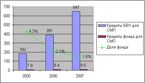 Рис. 3. Динамика прироста объемов кредитования БВУ и Фонда для СМП, 2005-2007 гг.